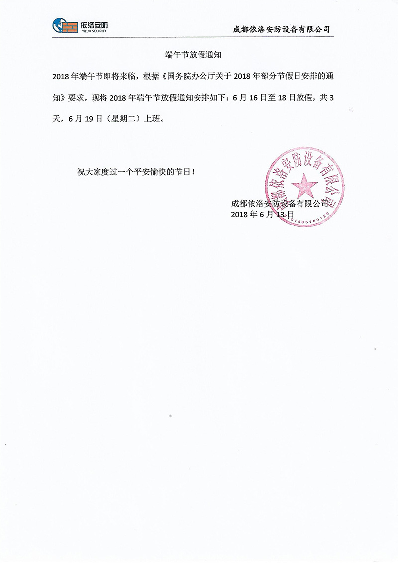 成都依洛安防設備有限公司端午放假通知